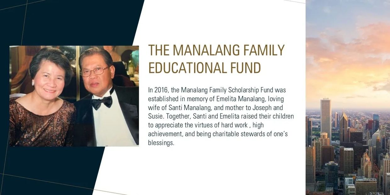 Through the collaborative work led by PP Noel Aquino, the Manalang Family Educational Fund started its annual scholarship grant to deserving engineering students in Washington State. In 2016, the Manalang Family Scholarship Fund was established in memory of Emelita Manalang, loving wife of Engr. Santi Manalang, and mother to Joseph and Susie. Together, Santi and Emelita raised their children to appreciate the virtues of hard work, high achievement, and being charitable stewards of one’s blessings. In that spirit, the Manalang Family has committed to providing meaningful support to the most deserving engineering students of AFEW.